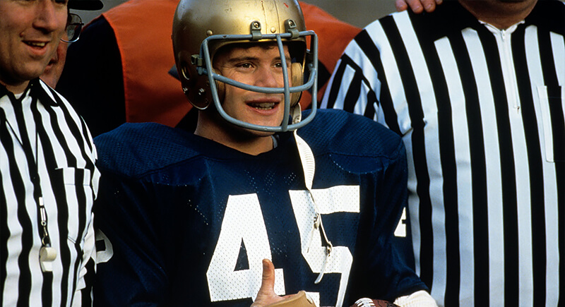 The most iconic moment in Rudy, where players stack their jerseys on Coach Dan Devine’s desk, demanding their walk-on teammate get to suit up, never happened. The coach had already decided to play Rudy, and years later, agreed to be the film’s villain for dramatic effect. Joe Montana confirmed on The Dan Patrick Show that the jerseys, the chanting crowd, and the near-mutiny were all invented.